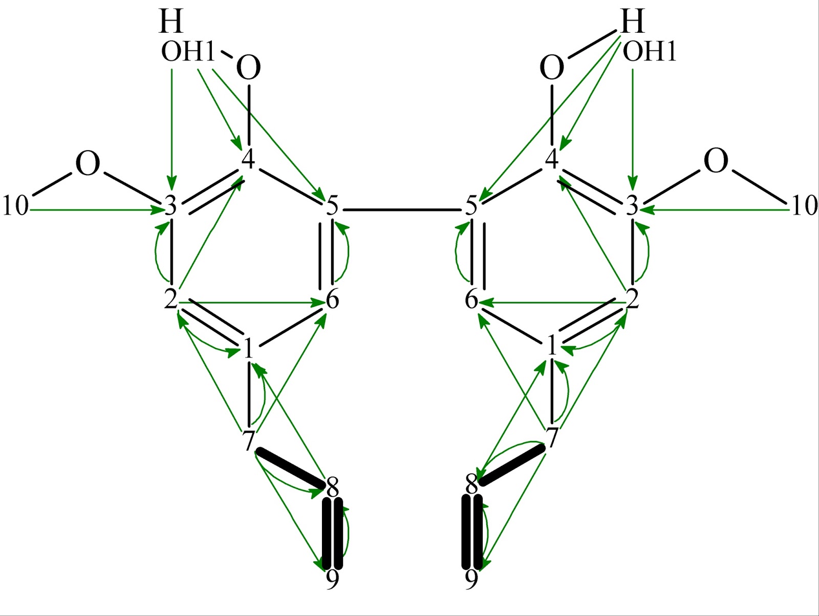 Analyzis of the 1D spectra indicated the presence of two oxygenated methyls, four methylene, six methine and eight quaternary carbons. The DQF-COSY spectrum indicated that H-9, H-8 and H-7 were in the same spin system, with H-9 being a terminal alkene. This indicated an allyl moiety. H-7 showed HMBC correlations with C-1, C-2 and C-6, suggesting the C-7/C-1 bond. The HMBC correlations of meta doublets H-2 and H-6 completed an aromatic ring with C-3, C-4 and C-5. The H-10 methoxy group exhibits an HMBC correlation with C-3, while the alcoholic proton OH1 correlated with C-3, C-4 and quaternary C-5. This overall suggested a structure similar to eugenol, with quaternary C-5 bonded with itself to form a dimer. A summary of DQF-COSY and HMBC correlations is shown at figure 4.