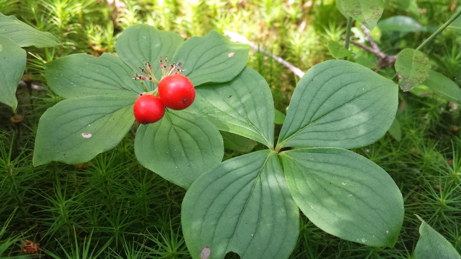 Pour Cornus canadensis, sa tige est ligneuse seulement à la base contrairement aux plantes herbacées communes. Les autres espèces de Cornus du Québec (C. rugosa, C. obliqua, C. stolnifera et C. alternifolia) sont pour la plupart des arbres et arbustes sauf C. suecica qui est une herbacée tout comme C. canadensis1.